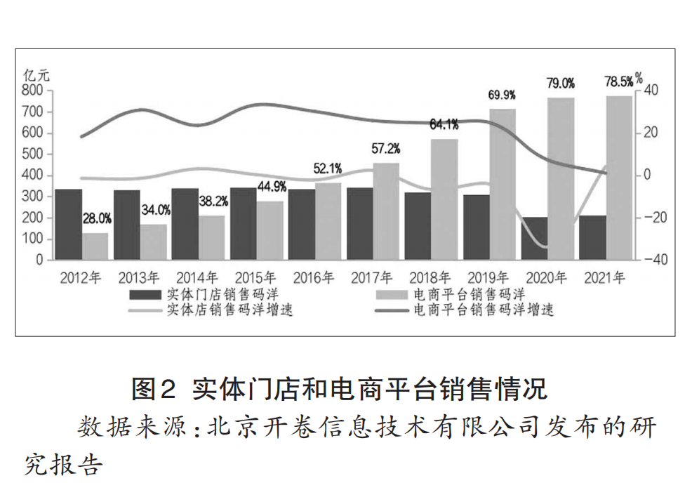 人口结构的互联网化,使得电商发展趋势进一步强化和巩固。电商平台图书销售逐年大幅增长,销售占比不断扩大。开卷数据显示,2013~2019年,电商平台图书销售的增长率长期保持在20%以上的高位快速增长,2021年受疫情影响,增长率才开始走平,实现正增长7.3%。而实体门店的图书销售在2012年之后一直是低位数增长,其中一半以上还是负增长,特别是2020年受疫情影响,同比下降了33.8%(见表2)。
