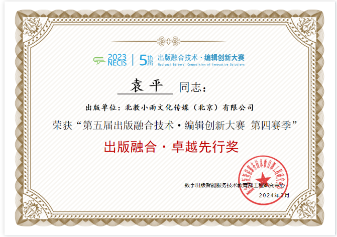 近日,第五届出版融合技术·编辑创新大赛公布第四季获奖名单。北京出版集团旗下北教小雨文化传媒(北京)有限公司共2个项目入选。其中,由张丽丽策划的“经典名著阅读课程化”丛书获“数智作品奖”;袁平获“卓越先...